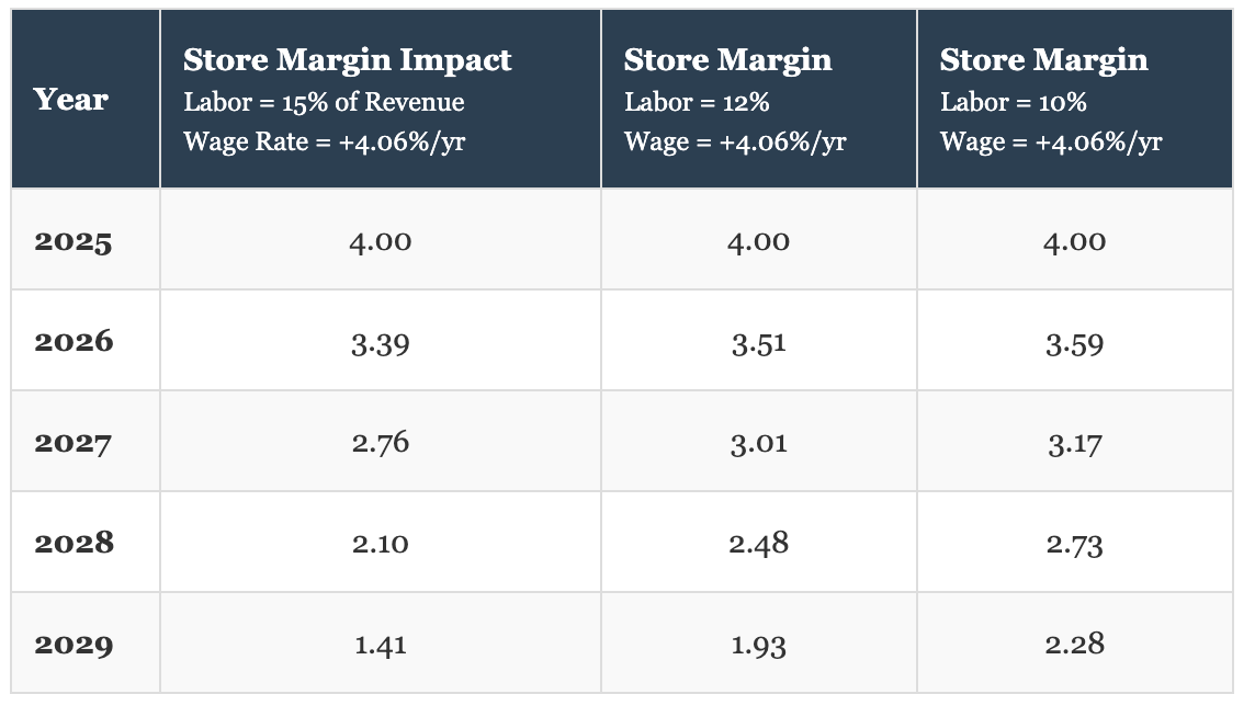 With the help of my new best friend and data gathering and analysis tool, Perplexity, financial modeling, incorporating these labor cost increases, reveals that store margins could decrease substantially due to wage rates by 2029, if all other expenses remain static, and especially if the overall cost of labor as a percentage of the business is also high.