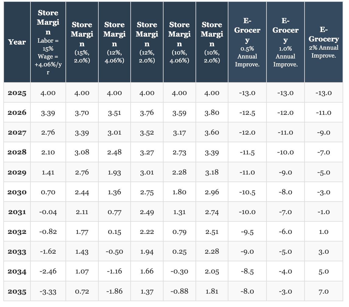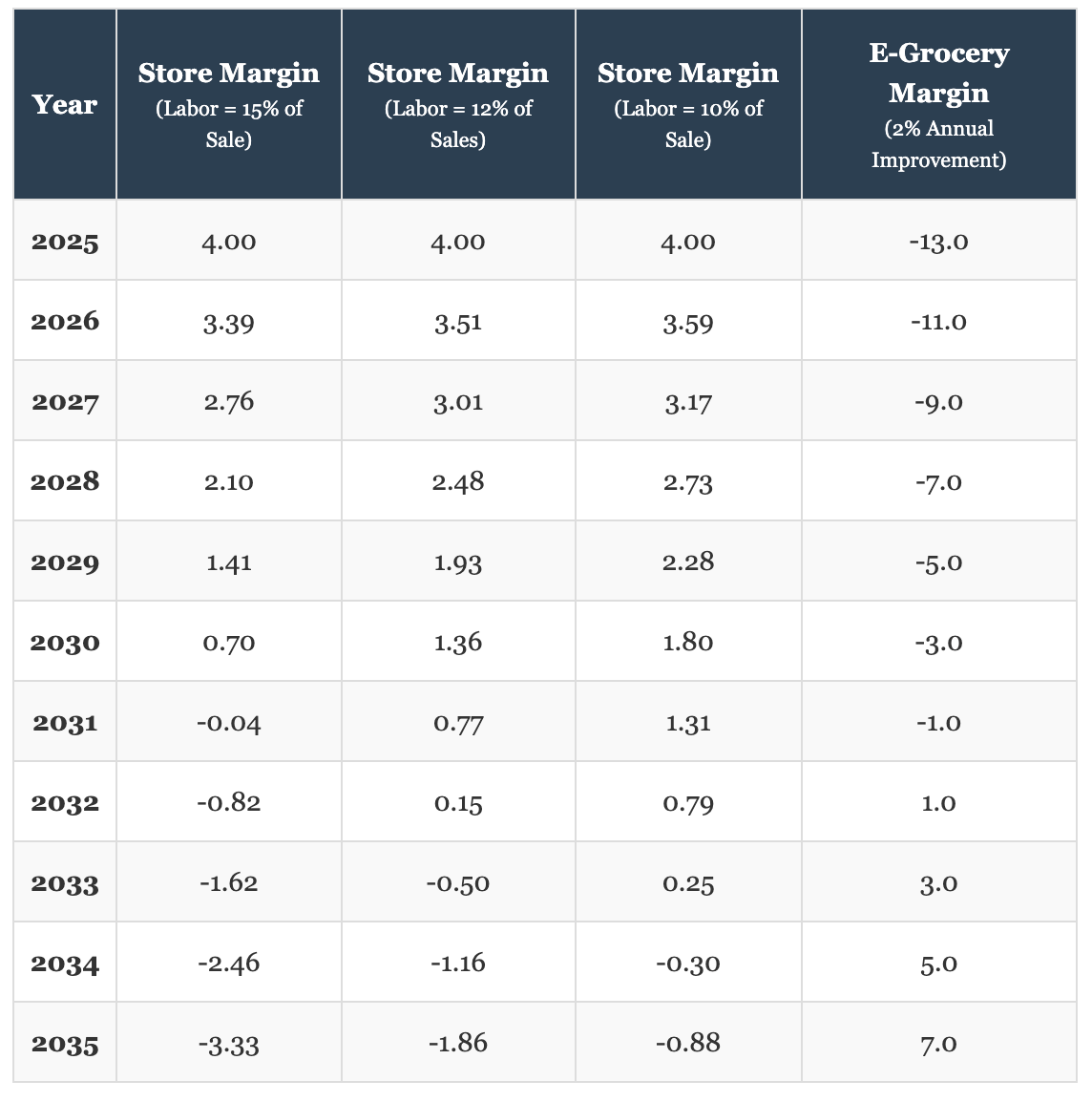 This adjustment does indeed move the profit crossover point further out beyond 10 years, but only if one assumes a much lower rate of wage increase. If the wage rate is assumed to hold at 4% per year for the next 10 years, we could see the inflection point anywhere between 2032 and 2035, if indeed e-grocery also delivers gains in the range of 1% to 2% per year.